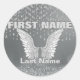 Ein silberner Aufkleber mit Engelsflügeln und Tränen. Fügen Sie einen Namen hinzu, um diese Vorlage anzupassen.
