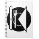 Dieser Entwurf ist ein Gedeck. Das Gedeck ist an einem Tisch und ist Schwarzweiss. Dieser Gedeckentwurf schaut auf diesem gewundenen Notizbuch groß
