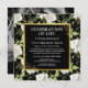 Feiern der Einladungen auf dem Platz des Lebens mit einem stilvollen schwarzen Hintergrund, eleganten weißen Blume, funkelnd Glitzer in Gold, einem Foto Ihrer Lieben und einer Begräbnisvorlage, die leicht zu personalisieren ist.
