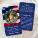 Premium USA Flag Memorial Funeral Prayer Card. Diese Gedenkkarte für das militärische Gedenkgebet enthält eine Flagge der Vereinigten Staaten von Amerika in einem modernen Design. Front "In Loving Memory" Personalisieren Sie diese militärische Beerdigungskarte mit Ihren Lieben Foto, Name & Daten und Stimmung. Front "In Loving Memory" " Helden leben ewig". Personalisieren Sie diese militärische Beerdigungskarte mit Ihren Lieben Foto, Name & Daten und Stimmung. Zurück Zitat "Ein Held ist...Jemand, der sein Leben etwas mehr als sich selbst gegeben hat." und Gebet "Wir halten dich Nah." , bitte beraten Sie, wenn Sie ein Design mit einem anderen Gedicht als einem anderen mögen möchten. Diese amerikanische Flag-Gebetskarte ist ein wertvoller Pfarrer, Ehre eines gefallenen Soldaten, militärische Beerdigungsdienste und Gedenkgottesdienst oder Lebensfeier für Veteranen. In Love Memory Military Memorial American Flag Gebetskarte. COPYRIGHT © 2020 Judy Burrows, Black Dog Art - Alle Rechte vorbehalten. Gedenkkarte des Soldaten-Gebet