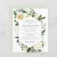 Elegante Feiern einer Lebenseinladung mit großen weißen Blume, eingebettet in schlanke, moderne botanische Blätter. Der Name des Verstorbenen wird in einem traditionellen Skripttext geschrieben. Der gesamte Text kann leicht bearbeitet werden, um eine persönliche Erinnerung zu schaffen.