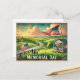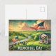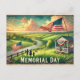 Hier ist eine Vintage Reisepostkarte im Aquarellstil für den Gedenktag, mit einer patriotischen amerikanischen Landschaft mit grünen Feldern, einem mit Fahnen getragenen HolzGazebo und einer Familie, die kleine amerikanische Flaggen windet. 🇺 🇸 ✨ Das Design hat weiche, verblasste Farben und nostalgische Vintage Typografie und schafft so einen warmen und charmanten Look.