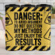 Dieses kühne, humorvolle Warnschild zeichnet sich durch "DANGER:" auf einem gelben Hintergrund mit schwarzen Gefahrenstreifen aus. Die selbstbewusste Nachricht lautet: "UM ARGUMENT ZU VERMEIDEN / NICHT FRAGE / MEINE METHODEN / NUR GENIESSEN SIE DIE / ERGEBNISSE" in krasser schwarzer Schrift. Die dreiecke mit den Zeichen für die Warnung des Schädels und der Ausrufezeichen verstärken ihren unsinnigen, düsteren Reiz.