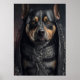 Ein erbitterter Rottweiler in einer schwarzen Lederjacke und Ketten.