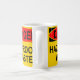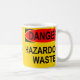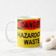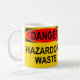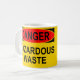 Ein lustiger Blick auf den Bürokaffee. Hellgelber Hintergrund mit dem Wort Gefahr oben in einem roten Oval. Gefährliche Abfälle ganz unten in schwarz.