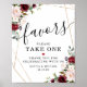 Florals mit bordeauxroten und rosa blütendem Bouquet und goldenes geometrisches Framing-Skript "favors" und klassische Typografie "bitte nehmen Sie eins" für das Hochzeitszeichen.
