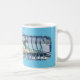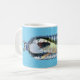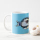 Coole Keramik Tasse, mit Grafik eines großen, weißen Hais gefangen in einer Wasserflasche, vor einem blauen Wellenhintergrund. Passen Sie Ihren eigenen Text an.