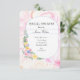 Es handelt sich um eine wunderschöne Brautdusche auf einem rosa gefärbte Krawatte Hintergrund, umgeben von einem Blumenkranz aus rosa, blauen und gelben Rosen.