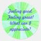Genießen Sie Lesen und/oder teilen Sie diese Wertschätzung Bestätigung, "Gefühl gut. Gefühl großartig! Was weiß ich zu schätzen?" auf einem geometrischen Bersthintergrund von grün und blau, bedruckt auf verschiedenen Produkten.