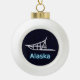 Eine schlichte weiße Silhouette eines Hundes schlug auf einem sternenförmigen Hintergrund. Der Text "Alaska" erscheint in leuchtendem Blau und Weiß.