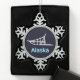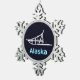 Eine schlichte weiße Silhouette eines Hundes schlug auf einem sternenförmigen Hintergrund. Der Text "Alaska" erscheint in leuchtendem Blau und Weiß.
