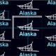Eine weiße Silhouette eines Hundes auf einem Hintergrund mit Sternenfeld. "Alaska" erscheint in blau-weiß.