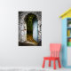 Ein porträtorientiertes Bild, das eine jahrhundertealte Steinmauer mit einem altertümlichen blauen Tor darstellt. Das Tor liegt in einem Ajar, der einen Blick auf den üppigen Garten und das grüne Unterholz hinter sich lässt.
