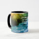 Diese Combo-Kaffee-Tasse zeichnet sich durch ein Aquarellbild des Ozeans aus, zusammen mit einem Life-Zitat über den lass und den Fluss der Dinge.