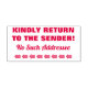 Die Briefmarke aus Gummi zeigt die Botschaften "KINDERN WIEDER ZUM SENDER!" und "Kein solcher Empfänger", zusammen mit einer dekorativen Pfeilform. Es könnte verwendet werden, um anzugeben, dass die empfangene Post falsch adressiert worden sein könnte, und sollte an den Absender zurückgeschickt werden.