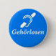 Das Internationale Symbol für den Gehörlosen über das Wort Gehörlose, was auf Deutsch "Gehörlose" bedeutet. Symbol und Wort in Weiß auf einem mittelblauen Hintergrund geschrieben.