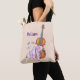 Eine personalisierte Tasche mit einem weichen femininen Design. Illustriert mit einem Aquarellbild einer hölzernen Geige, ein paar rosa Ballettschlappen, die darauf stehen und mit Blume und Schmetterlingen geschmückt sind. Set auf einem pfirsichrosa Hintergrund.