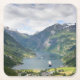 Untersetzer mit dem berühmten Fjord Geirangerfjord, einem Kreuzfahrtschiff und dem Dorf von Geiranger zwischen den Bergen in Norwegen. Eine große Andenken!