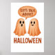 Zwei Cartoon-Geister mit unterschiedlichen Ausdrücken führen ein Gespräch. Über ihnen steht eine Sprechblase: "Lasst uns über Halloween reden."