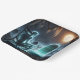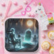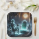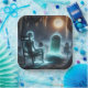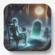 Eine geistreiche männliche Figur sitzt in einem Schaukelstuhl, gegenüber einem Grabstein mit der Aufschrift "R.I.P." unter Vollmond.