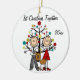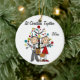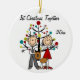 Ein hübsches rundes Keramikandenken 1. Weihnachten verzieren zusammen Eigenschaften, die ein Strichmännchenpaar ganz oben ankleidete, ihn mit einem Shirt und Krawatte, sie in einem roten Kleid, mit dem Hund, der vor dem Weihnachtsbaum stehend ist. Addieren Sie leicht Ihre Namen und das laufende Jahr, um es zu personifizieren!