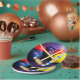Spaß und bunte Krocketkugeln und Holzhammer, getan oben in einer Schmutzart.