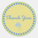 Dots und ein kleines blaues Bouquet machen dies zu einem ganz besonderen Dankeschön Aufkleber. Der Hintergrund ist ein tanges Zitronengelb. Es gibt zwei Reihen von Punkten. Die kleineren Punkte auf der Außenseite sind grün und die innere Reihe der größeren Punkte ist cornblumenblau. Das Blau passt zum blauen Blumenstrauß. Vielen Dank auch blau und geschrieben in einem angesagten und coolen modernen Schriftart.