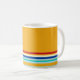 Eine farbenfrohe, gelbe Tasse mit Streifen unten in Rot-Blau und Aqua .