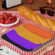 Orangefarbene, gelbe, Lila und schwarze Streifen Papier Teller für diejenigen, die Liebe der Farben Halloween. Hinzufügen von Text zum Design. Von https://www.zazzle.com/store/celestesheffey