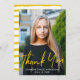 Moderner Abschluss Dankeschön-Karte mit dem Foto des Absolventen mit "Danke" in gelben Pinselschrift Schrift. Personalisieren Sie die Vorderseite des Foto Abschluss danke Ihnen Karte, indem Sie den Namen und Abschluss des Absolventen Jahr. Die Rückseite der Karte bietet Platz für Ihre eingegebene oder handgeschriebene Danksagung mit einem gelb-weiß gestreiften Hintergrund.