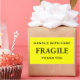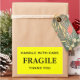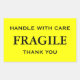 Aufkleber mit: Fragile. Mit Vorsicht umgehen. Vielen Dank. Schwarzer Text auf einem gelben Hintergrund. Personalisieren Sie Ihre Informationen mithilfe der einfachen Vorlagen. Schriftart, Schriftart, Schriftart und gelbe Hintergrundfarbe sind anpassbar.
