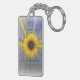 Eine gelbe Sonnenblume ist in diesem unendlichen Design enthalten. Der blaue Hintergrund ergänzt das Gelb und Braun der Sonnenblume. Das gleiche Design ist auf der Vorder- und Rückseite dieses Schlüsselanhängers.