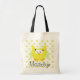 Eine niedliche Eule aus hellgelb und weich grün mit großen Augen auf einem Hintergrund von kleinen gelben und grünen Eulen und einem Bereich, den Sie leicht einen Namen hinzufügen können, um diese Uhu Tote Tasche zu personalisieren!