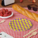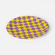 Abstrakte digitale Kunst von lila und gelben Quadraten in einer karierten Formation.