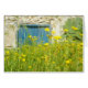 Gelbe Blume in Blüte mit blauen Holztüren und Steinmauern