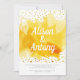 Gelbe Aquarellfarbe, Blätter und goldene Konfetti Typografie Einladung Hochzeit.