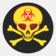 Schwarzer Aufkleber mit einem Biogefährdung Symbol Schädel und Kreuzknochen in Rot und Gelb.