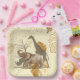 Gelbe goldene Blätter, Elefanten, Giraffen-Rhinozeros-Papiere Teller. Karo aus der Erholung dieser Safari-Geburtstagssammlung. Teller auf Papier.