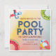 Gelbe blaue strahlende Schwimmbecken Party Einladung Card. Diese farbenfrohe personalisierte Party Einladung des Pools bietet verschiedene Poolartikel wie Limonade, schwimmende Schläuche, Flip Flops und Früchte.
