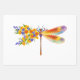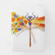 Künstlerisch bemalt, florale Libelle in kontrastierender Orange und lila mit gelben, hellen, blühenden kalifornischen Mohn und blauen Wildblumen auf weißem Hintergrund.