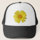 Ein abgeschiedenes Foto eines gelben, blauen Farbtupfers, das nach einer Regendusche fotografiert wurde und die Regentropfen auf den Blättern zeigt