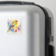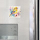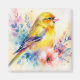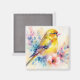 Dieser Magnet zeigt eine Wasserfarben-Grafik eines gelben Singvogels, umgeben von weichen botanischen Blumen in rosa, türkis und violetten Farbtönen.