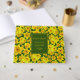Ein helles und fröhliches Blumenmuster, das die Narzisse darstellt, eine klassische Frühlingsstiftung, die mit der Wiedergeburt und Neuanfängen verbunden ist. Das perfekte Thema für eine Frühjahrshochzeit, die aus gelben Narzissen in voller Blüte besteht, die auf einem grünen Garten-Hintergrund angeordnet sind. Text ist in einem Skriptstil, goldgelb in Farbe und ist leicht an die Namen, Daten und Orte Ihrer Wahl angepasst.