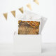 Bezaubernder Erntedank Gefallen Tasche mit einem rustikalen Holzboden und warmen Herbstlauben. Das elegante "Happy Thanksgiving"-Skript und ein anpassbarer Raum für eine persönliche Nachricht oder Familienname. Ideal für jede Ansammlung!