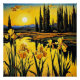 Die von A.I. kreierte Interpretation lebendiger Gelb- und Goldfarben dominiert die Landschaft, wo große Zypressen den Flussufer unter einem Sonnenuntergang bedecken. Im Vordergrund wird eine Gruppe von Iris-Blume hervorgehoben, deren Reflexion in den ruhigen Gewässern unten sichtbar ist.