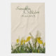 Ein teatowel mit einem Foto gelben und weißen Iris bucharica mit Grün-Blätter auf einem Sahnehintergrund, mit den Text-Vorlagen, zum mit Braut- u. Bräutigamnamen auszufüllen und Datum des Ereignisses, für ein Brautparty-, Hochzeits- oder Jahrestagsgeschenk. Zusammenpassendes Hochzeitsbriefpapier mit dem gleichen Entwurf verfügbar.
