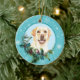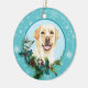 Auf der Vorderseite dieses Holiday-Ornament ist ein schönes Porträt eines gelben Labrador Retriever Hundes, der aus einem heiligen und immergrünen Husten pinkelt. Rote Beeren und Kiefernkonen schmücken die heiligen und kiefernroten Früchte. Das Bild wird auf einem blass blauen Kreis gerahmt durch ein Retro-blaues Schneeflockenmuster platziert. Die Rückseite des Ornaments hat den gleichen Hintergrund und Kreis mit Ihrem benutzerdefinierten Text in blau.