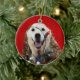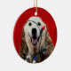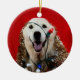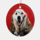 Gelbes Labrador Retriever hat Spaß mit den Weihnachtsdekorationen zu spielen gehabt und macht sich im Geringsten keine Sorgen, dass es unartig ist, Hundefreunde zu sein, die Weihnachtsschmuck Keramik