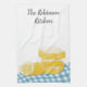 illustriertes Handtuch mit Zitronen- und Zitronenbalken und niedlichem hellblauem kariert. Ideal für eine Landküche oder eine Touch Zuhause gemacht.