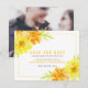 Einfache botanische Hochzeitskunst in goldgelben und orangefarbenen Tönen, mit grünen Blätter auf weißem Hintergrund, Save the Date Karte. Bearbeiten Sie diese Save the Date Karte mit Ihren eigenen Namen und dem Hochzeitstermin auf der Vorderseite und Ihrem eigenen Foto auf der Rückseite. Weitere passende Artikel sind verfügbar. Original Aquarellmalerei und Design von Sarah Trett für www.mylittleedenweddings.com